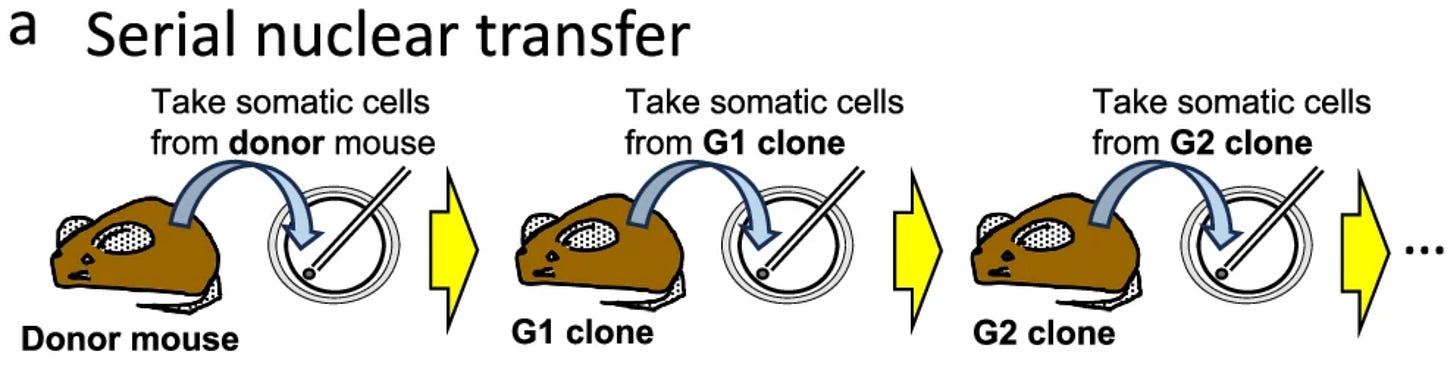 Last month there was an interesting paper in Nature Communications, “Limitations of serial cloning in mammals,” which showed that after 58 generations a cloned mice population had degraded genetically to the point where further cloning was impossible.