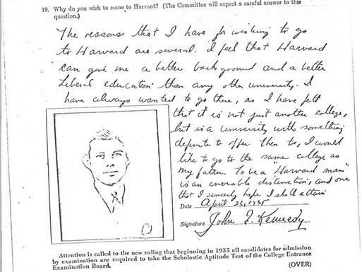 I also remembered John F. Kennedy’s admissions essay to Harvard, which went viral some time ago for its risible—to a 21st century reader—brevity, and I thought Kennedy’s work was a useful counterpoint to Wang’s. Taken together, they provide an easy way to survey changes in elite selection in American society.