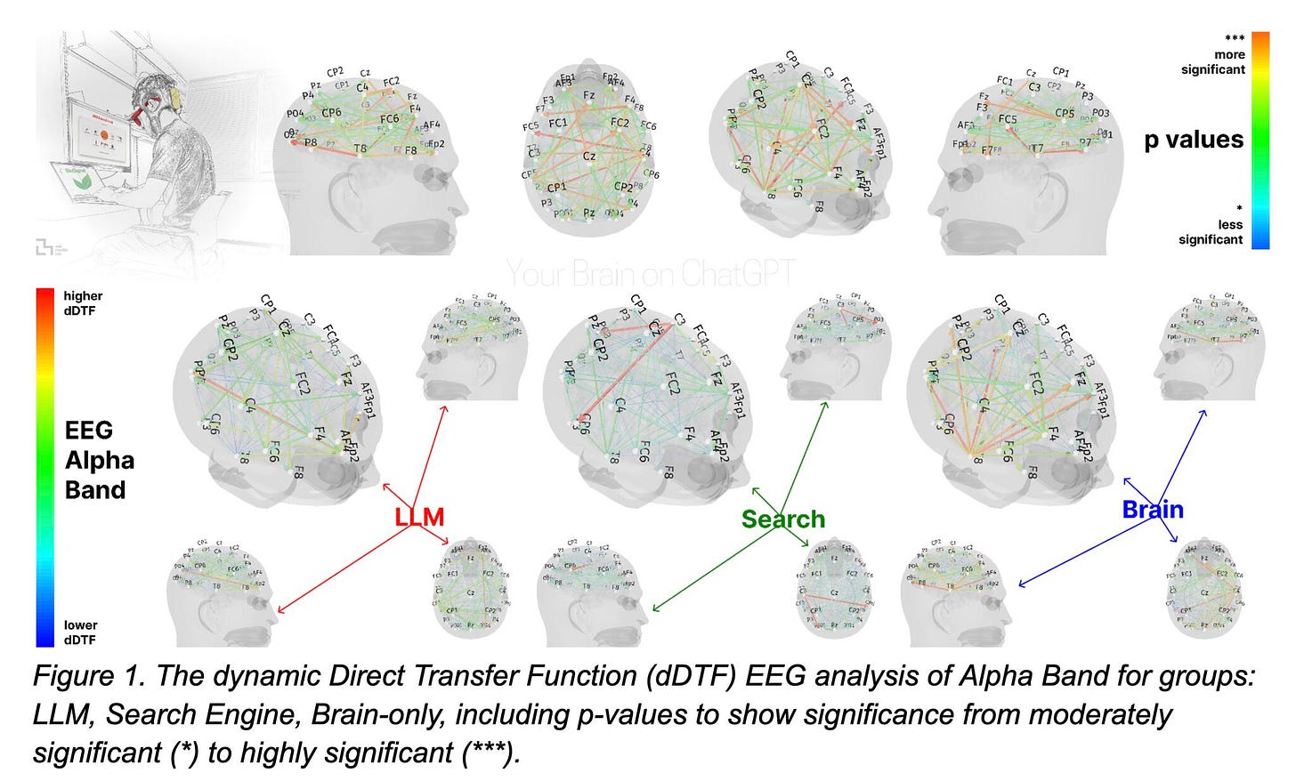 The researchers found that “EEG revealed significant differences in brain connectivity: Brain-only participants exhibited the strongest, most distributed networks; Search Engine users showed moderate engagement; and LLM users displayed the weakest connectivity.” They also noted that “cognitive activity scaled down in relation to external tool use.”
